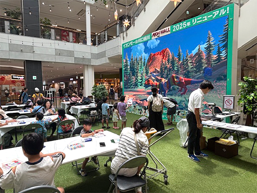 イオンモール川口前川(埼玉県川口市)で2025年8月9日(土)~15日(金)に『おえかきパラダイス恐竜3D』『ペイントすなば』をご利用いただきました。合わせて日販テクシードオリジナルの『工作ワークショップ(恐竜ぼうし)』を行いました。