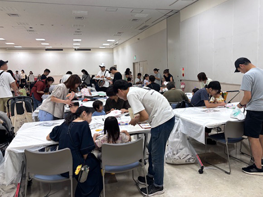 1F サウスコートの「おえかきパラダイス」と2F サイボーホールの「ペイントすなば」「工作ワークショップ」の会場を行き来する来場者が多くいました。