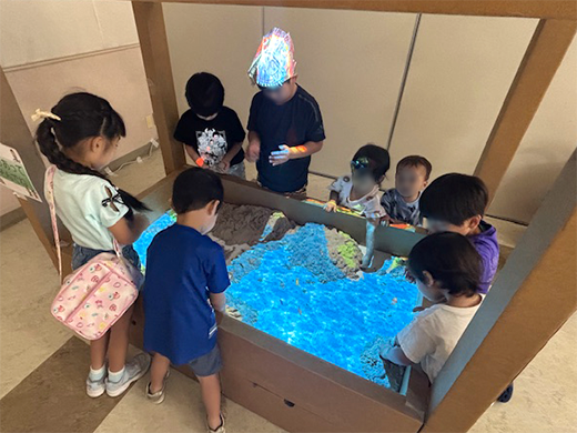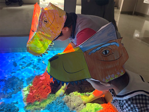 1Fでは大きな画面でぬりえが動くたびに興奮する子どもたち、2Fでは子どもがすなばで遊び、お父さんお母さんがテーブルで恐竜ぼうしを作る姿がありました。
