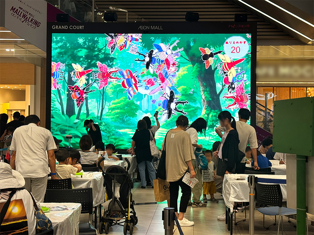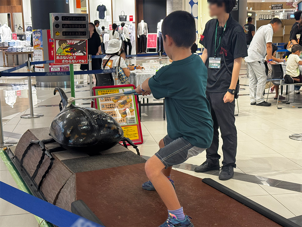 1階グランドコートには、超大型昆虫ロボット(サカダチコノハナナフシ)、昆虫ロボット(日本カブトムシ)が登場。ホビーコートでは、「おえかきパラダイス」「ペイントすなば」、「ヘラクレスオオカブトとつな引き対決」の参加型アトラクションを展開しました。