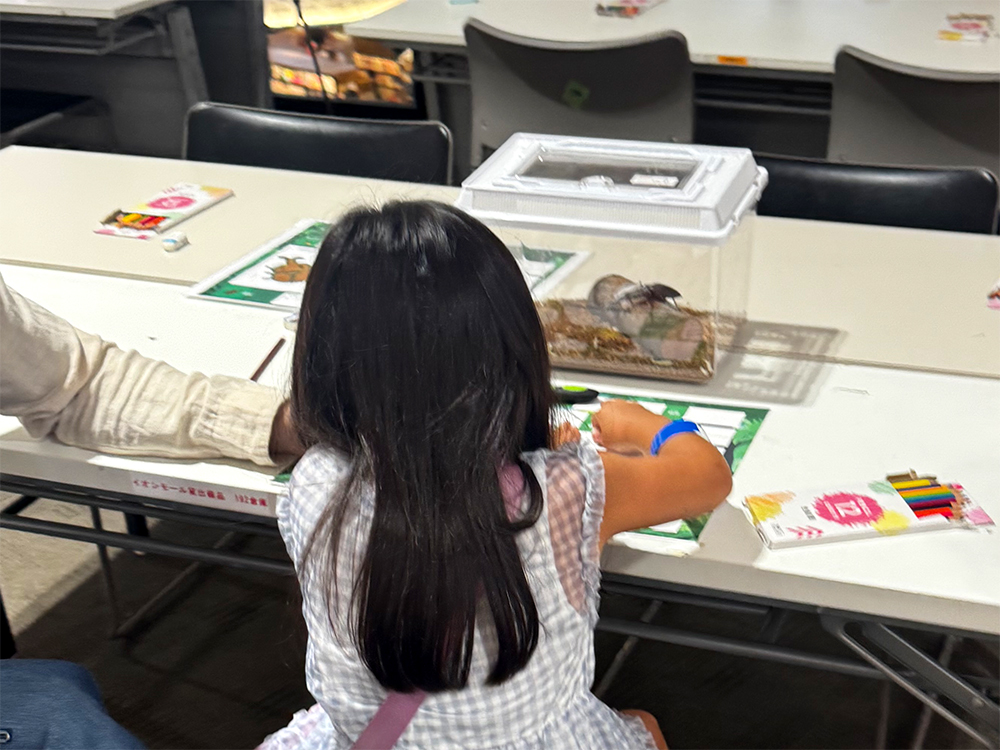 2階では、ワークショップ「世界の珍しいカブトムシ・クワガタムシを観察しよう」が開かれ、自由研究に活用されました。