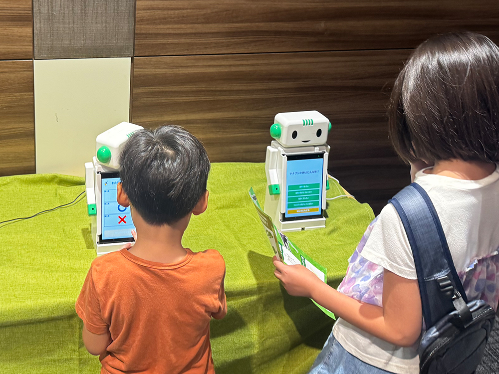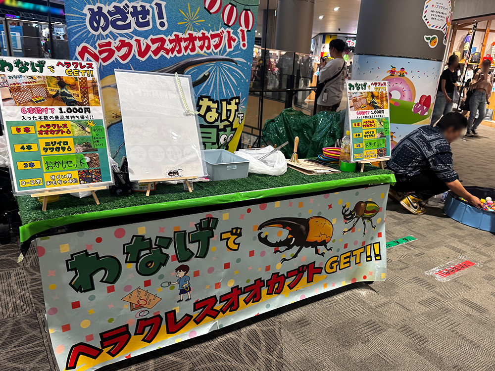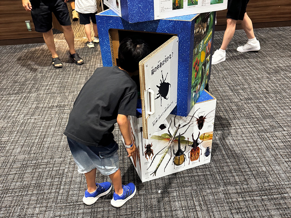 3階は、約30種類の昆虫の生体展示、約50種類のジオラマ標本展示、小学館の図鑑NEOのパネル掲示、ロボットを使った昆虫クイズと、昆虫を間近に見て学べる場でした。ホビーゾーン前では、入った本数で景品がもらえる輪投げやおもちゃすくいが出店し、縁日のようでした。