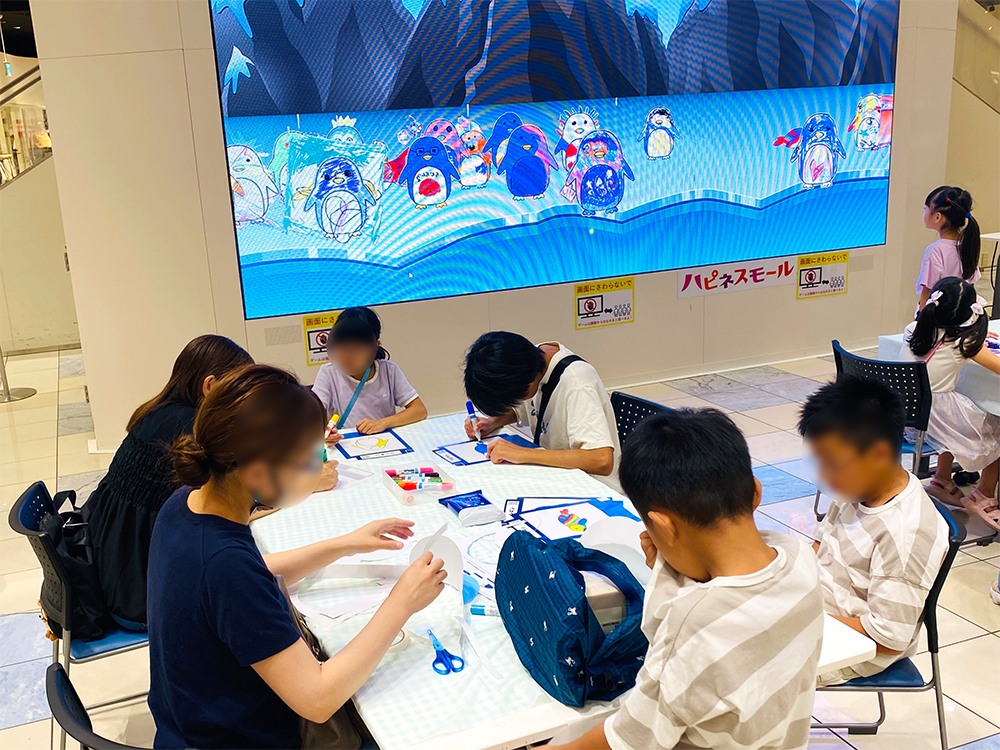 1Fセントラルコートの大型スクリーンに「おえかきパラダイス」の南極の背景が映し出され、ぬりえしたペンギンやアザラシが動き出すと、暑い夏も少し涼しく感じられました。