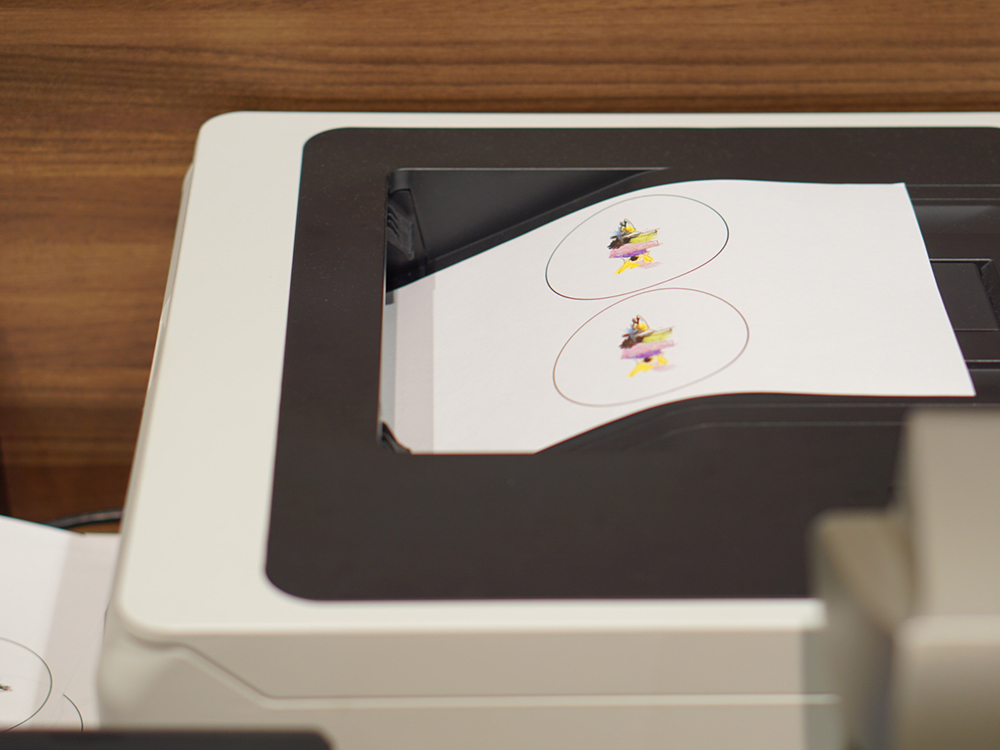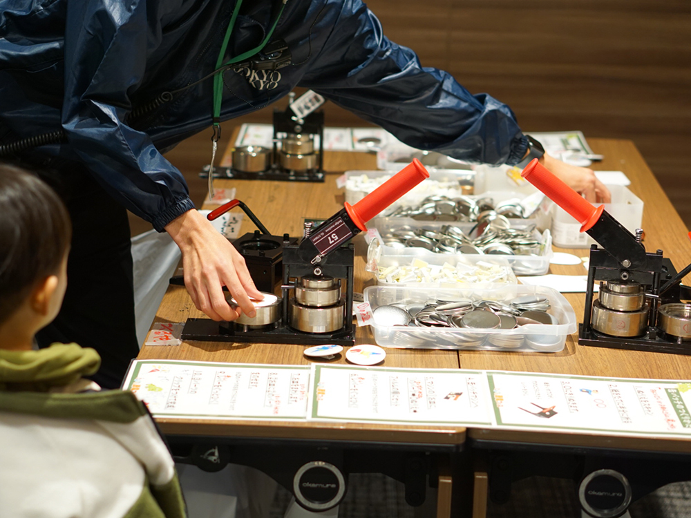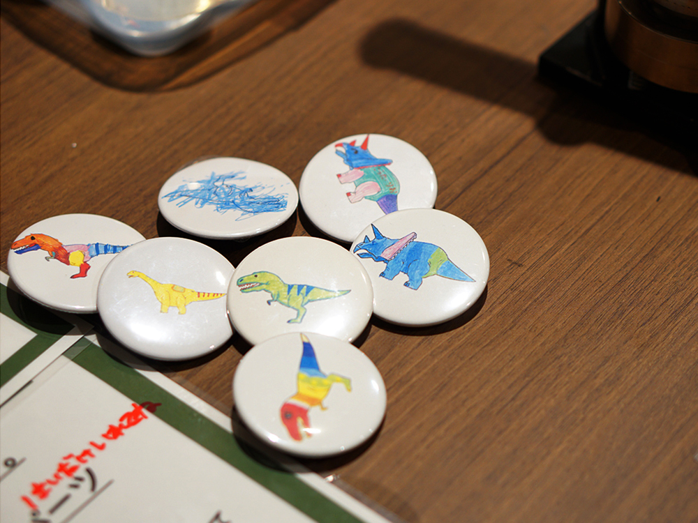 おえかきパラダイスで描いた絵をその場で縮小印刷して缶バッジを作ることができます。