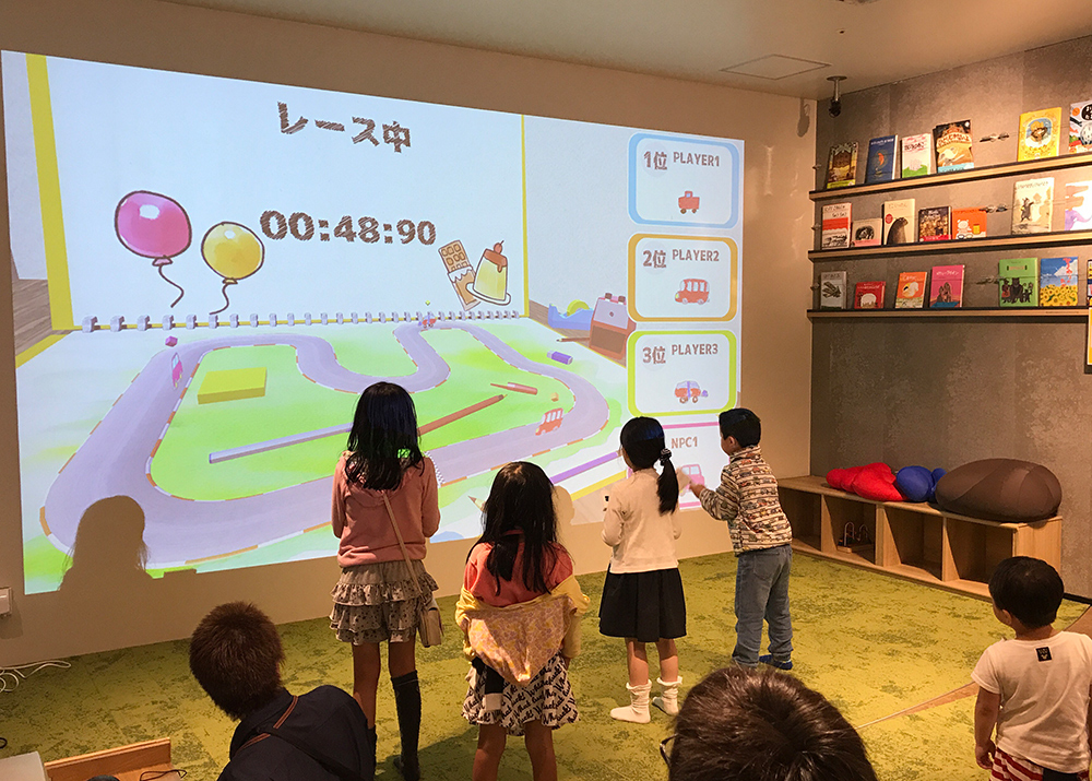 車の絵を描いたりぬりえをしたりしてスキャンすると、自分だけの車でレース対戦ができます。フラッグ型のコントローラーをたくさん振ると加速。白熱レースで賑やかな会場作りができます。新規店のオープニングイベントや展示会など大きなイベントの機会にもぴったりです。