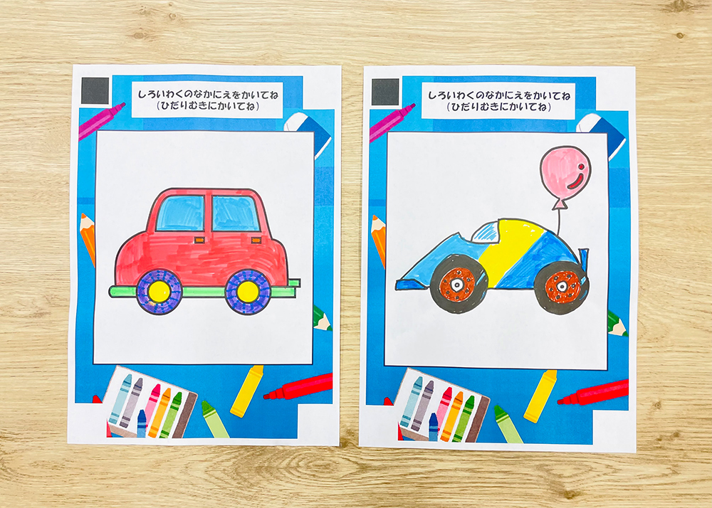 用紙は白紙とぬりえの2種類。白紙は好きな車を自由に描くことができます。(実は車以外を描いてもOKです…!)小さなお子様にはぬりえがおすすめです。