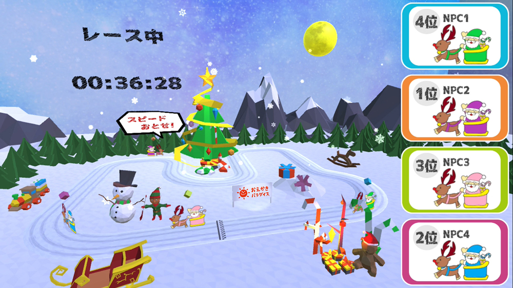 「ハロウィンバージョン」では、かぼちゃ、おばけ、ゆうれい、こうもりがハロウィンの世界観のコースで競争します。「クリスマスバージョン」ではトナカイに乗ったサンタで雪道を競争。季節のイベントにいかがでしょうか。