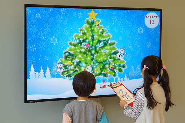 描いた絵が大画面で動き出すデジタルイベント。ゆきだるまのぬりえがツリーの周りを楽しく飛び回ります。欲しいプレゼントを描いて取り込むと画面の中でサンタが運んできてくれます。